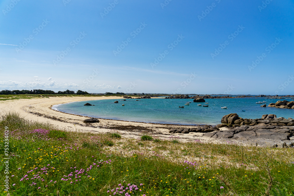 Plage de sable blanc, dunes verdoyantes et Armérie maritime en fleurs : la beauté naturelle du littoral breton.