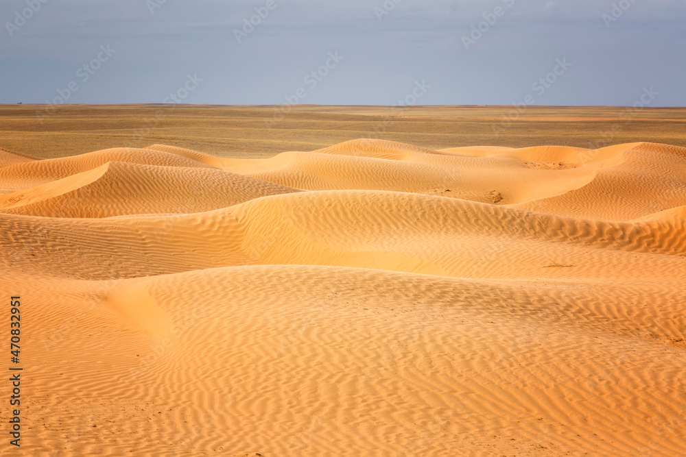 Woman standing alone with raised hands from behind against the warm light of sunrise sky over the green field. Grateful for life and new day concept. Surrender to God.