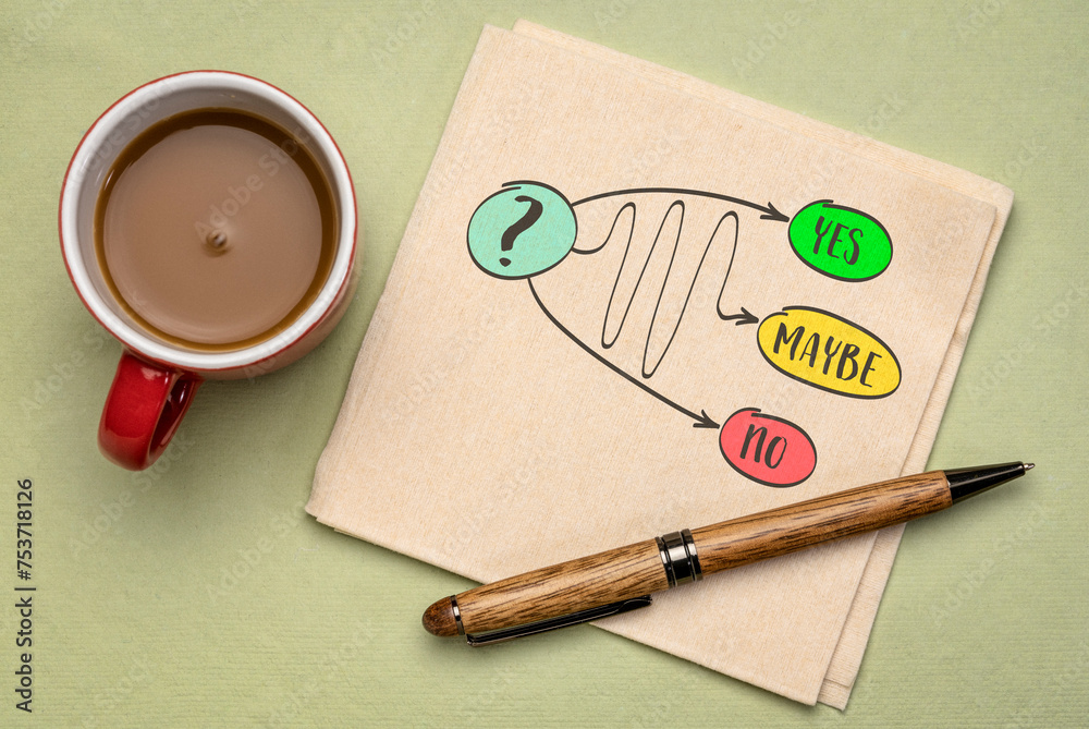 yes, no, maybe - voting, hesitation or decision concept, sketch on a napkin with coffee