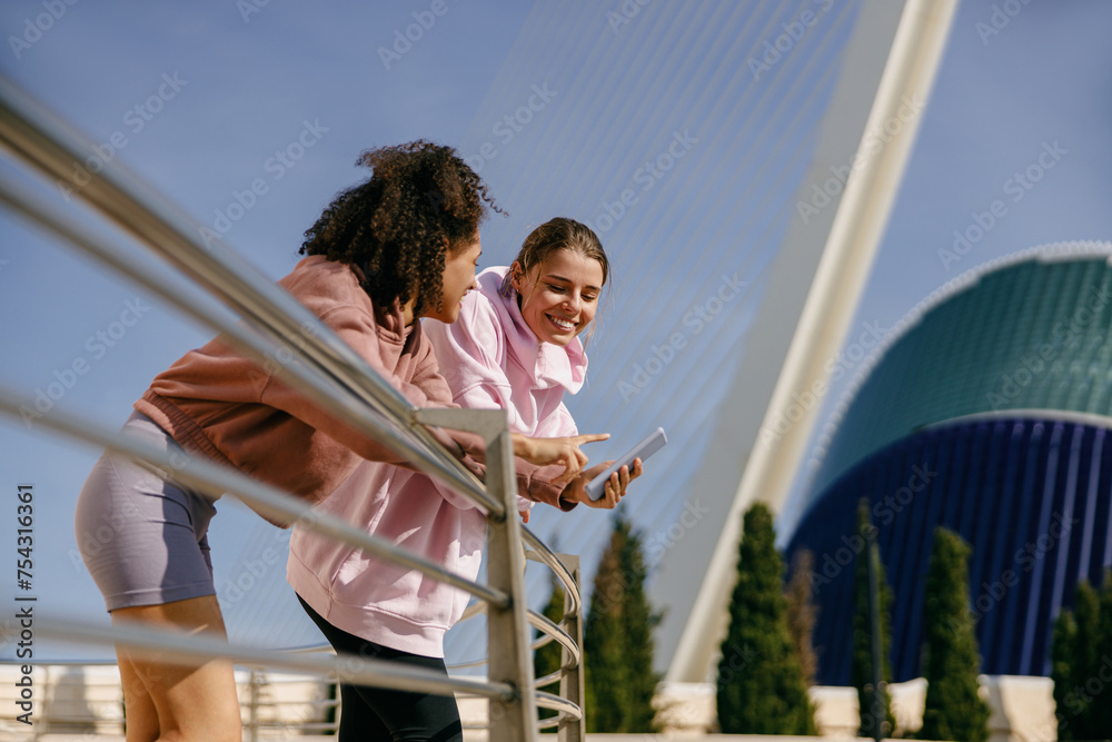 Women athlete in sportswear have a rest after morning jogging outside and talking each other