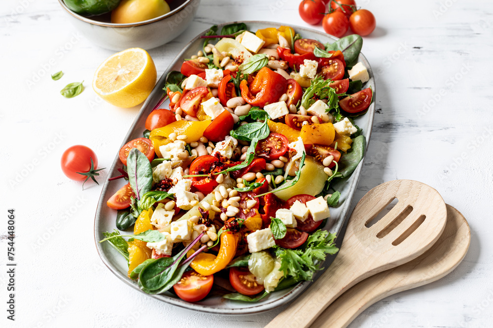 Roasted pepper and butter bean salad with harissa dressing on white background.