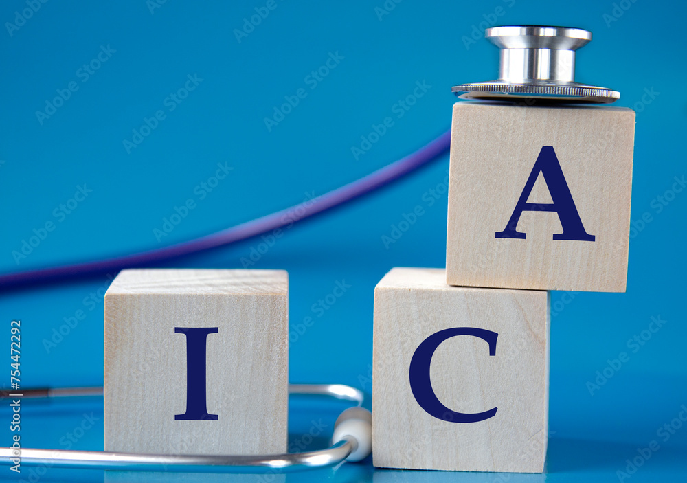 ICA - acronym on wooden large cubes on blue background with stethoscope