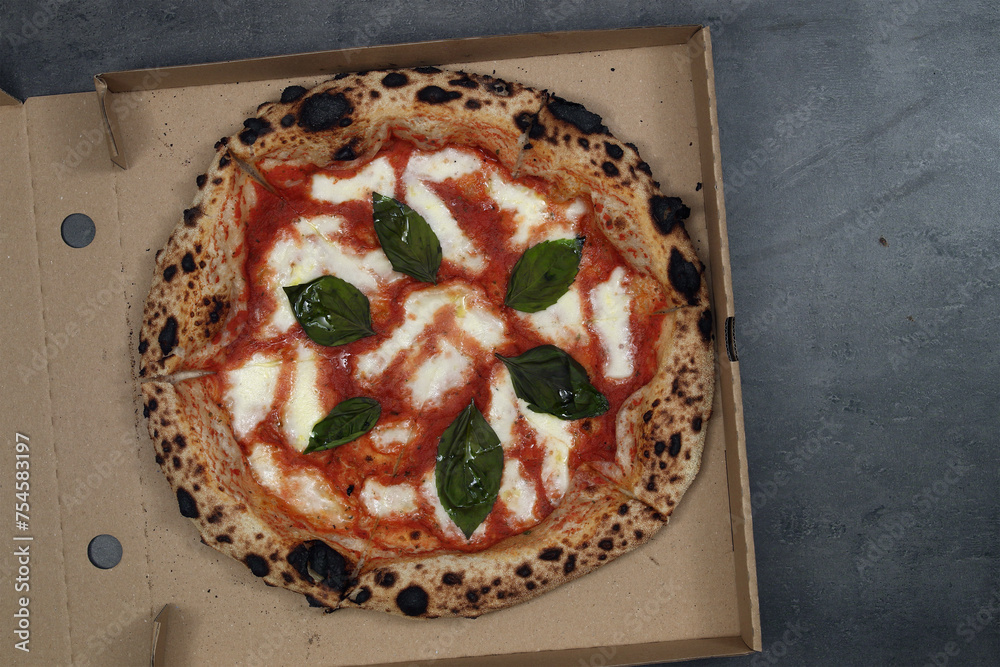 Best owen baked italian pizza margherita. Top view on pizza in delivery paper box.