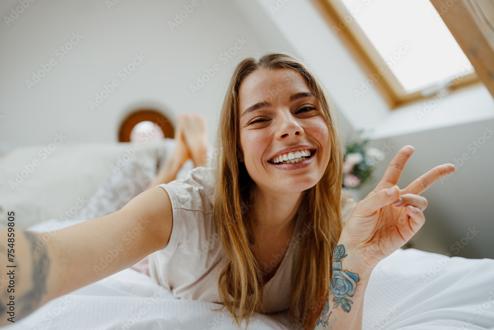 A woman on a bed, flashing a smile and peace sign while taking a selfie