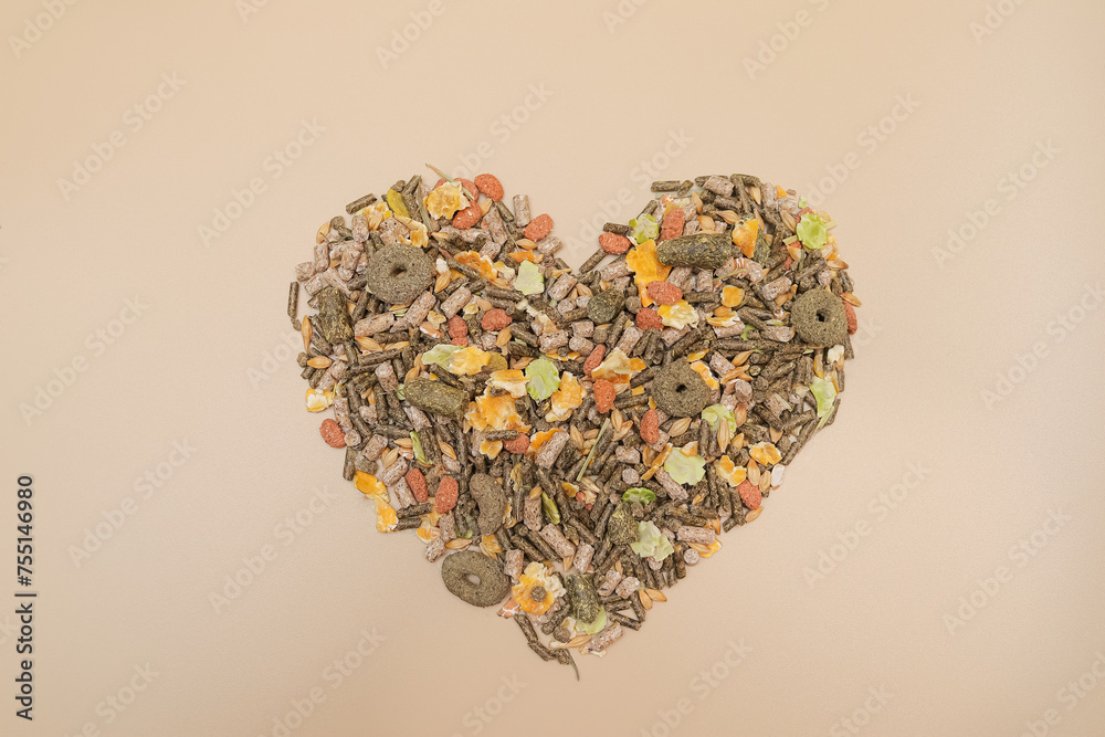 heart shaped dry pelleted pet food for rodents like rabbits, guinea pigs, hamsters, rats, mice, chinchilla, degu, squirrels. Top view.