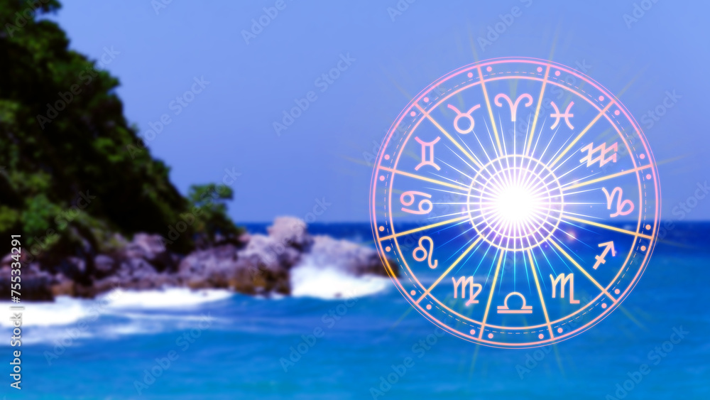 Concept of astrology and horoscope, person inside a zodiac sign wheel, Astrological zodiac signs inside of horoscope circle, Astrology, knowledge of stars in the sky, power of the universe concept.