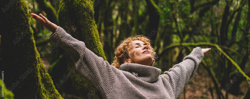 Celebrating freedom and nature love. One woman outstretching arms in the forest with green trees trunk and musk in background. Happiness and wellbeing in natural healthy lifestyle people in leisure