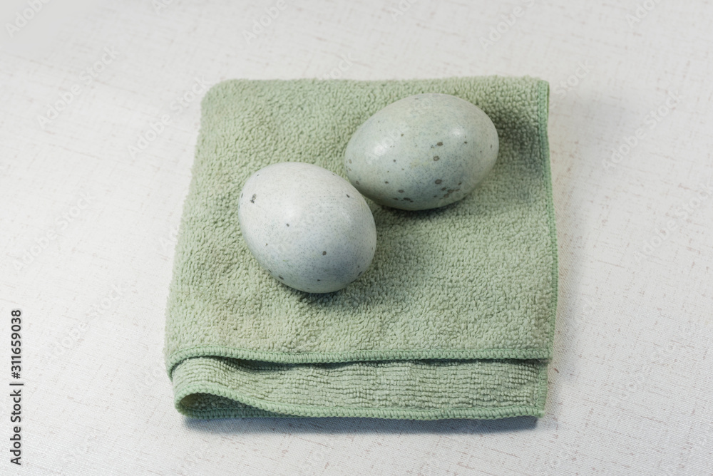 Basket with painted white and golden eggs, bunny and yellow tulips on light green background. Easter concept. Closeup