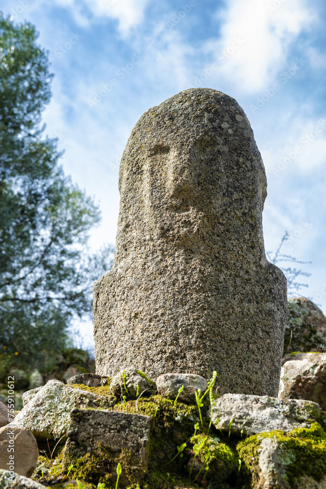 Close-up of a menhir with a human face carved on the megalithic site of Filitosai, southern Corsica, France
