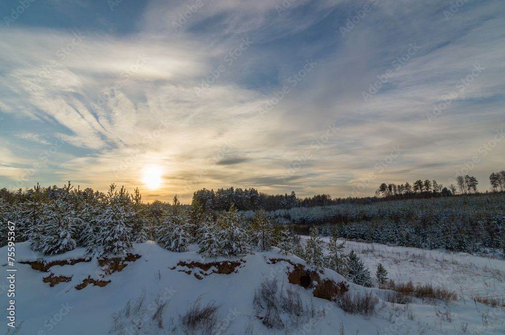 зимний пейзаж на закате в лесу