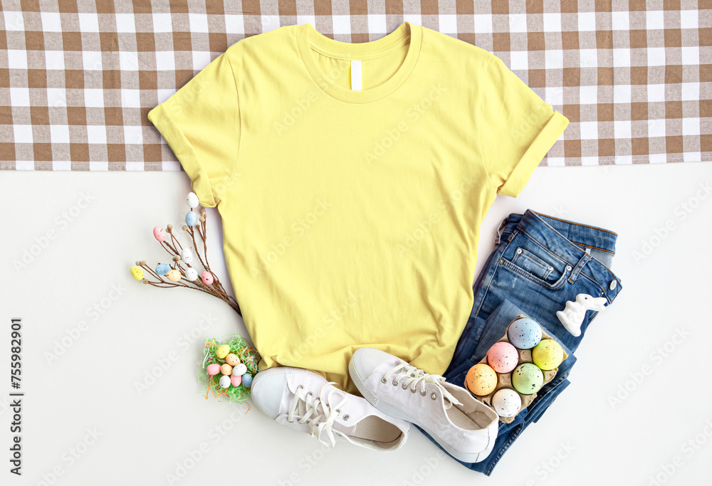 Yellow Shirt Mockup. Blank T-Shirt Mock Up,Shirt Mockup, Front View. With Easter Eggs. Ready To Replace Your Design. template, flat lay , top view, copyspace.