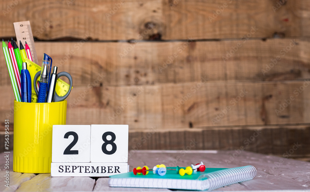 September calendar background with number 28. Stationery pens and pencils in a case on a wooden vintage background. Copy space notepad with pencils and calendar. Planner place for text.