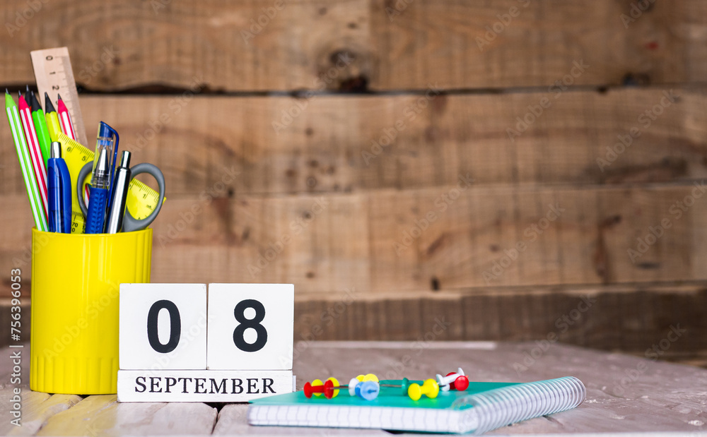 September calendar background with number 8. Stationery pens and pencils in a case on a wooden vintage background. Copy space notepad with pencils and calendar. Planner place for text.