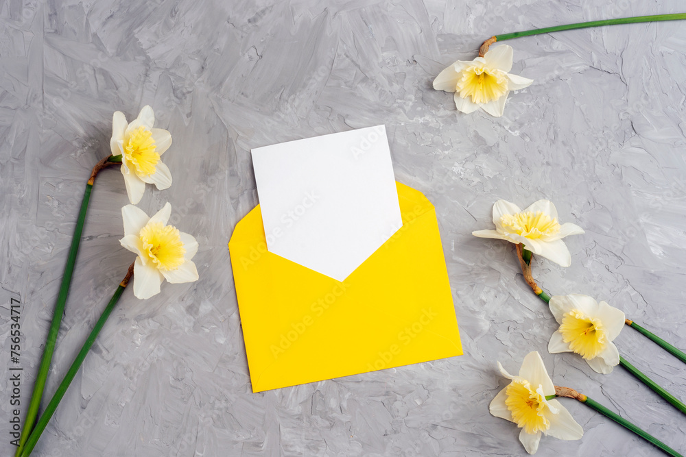 Yellow envelope with blank card and daffodils flowers on textured gray background. Top view, flat lay, mockup