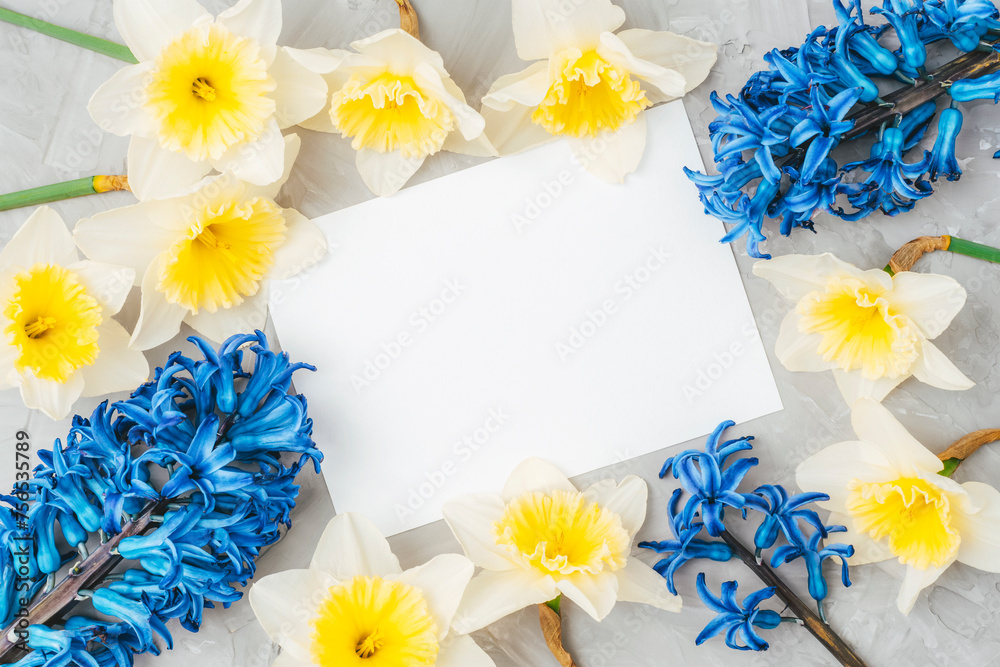 Blank card, yellow daffodils and blue hyacinths on gray background. Top view, flat lay, mockup. Spring concept