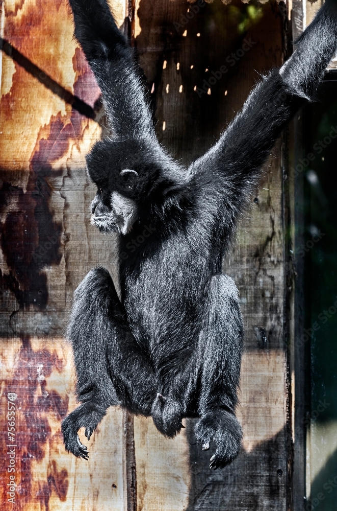 Northern white-cheeked gibbon male hanging on the rope. Latin name - Nomascus leucogenys