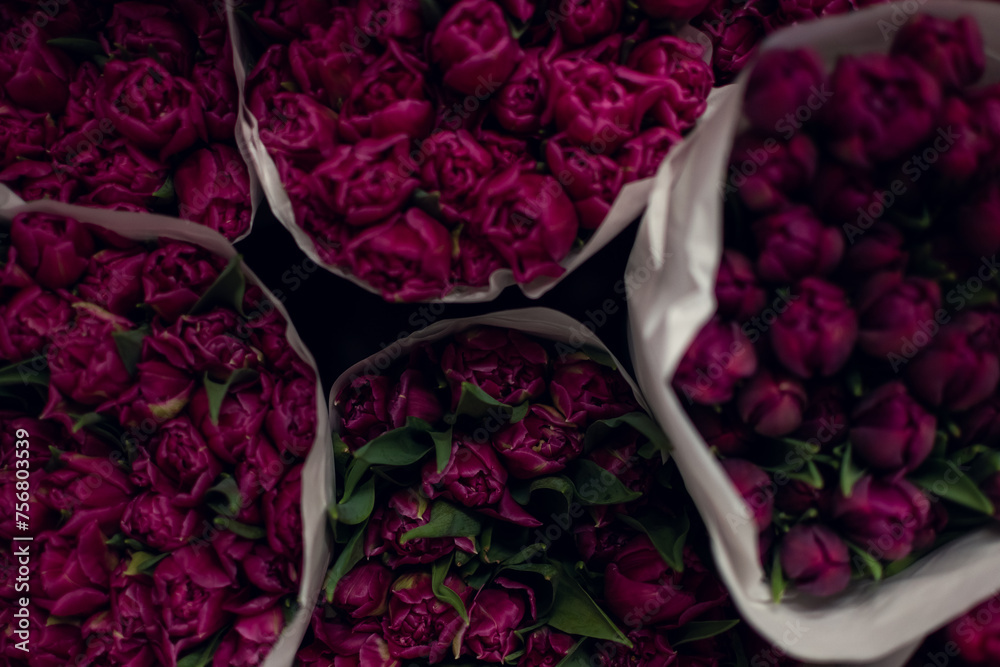 Preparing tulips bouquets in the store for the holidays. View from above. Women's Day.