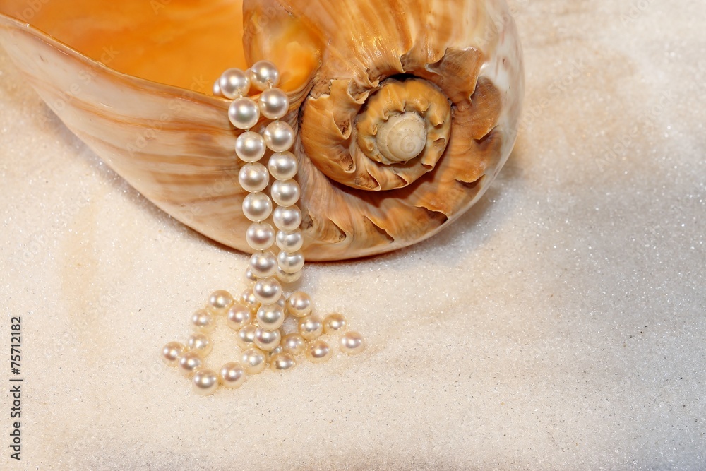 Muschel und Perlen im kristall Sand