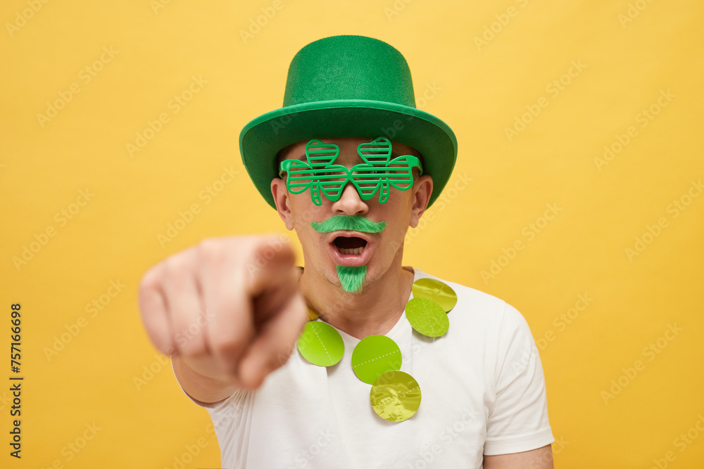 Shocked frighten scared man wearing green leprechaun hat and shamrock glasses posing isolated over yellow background looking with open mouth pointing at you