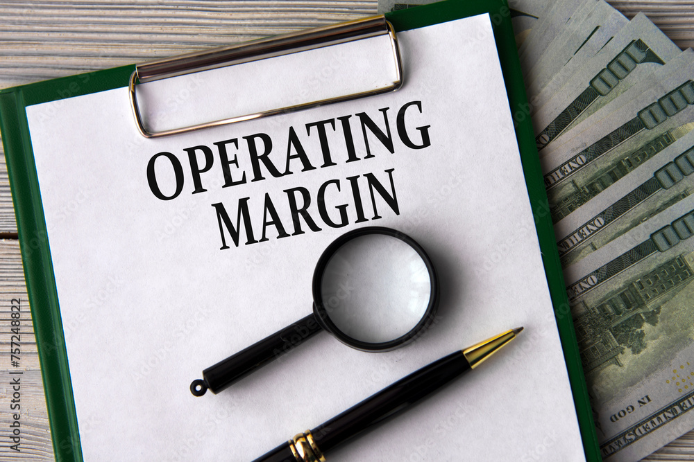 OPERATING MARGIN - words on a white sheet on the background of banknotes, magnifying glass and pen