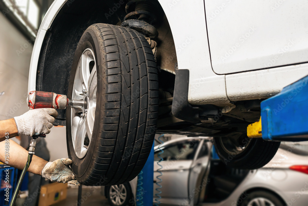 Auto mechanic tightens bolts on a wheel after repair using an air gun in an auto repair shop