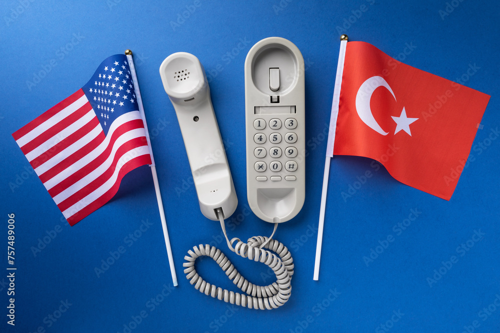 USA, Turkey flag and old corded telephone on a blue background, concept on the theme of telephone conversations between countries