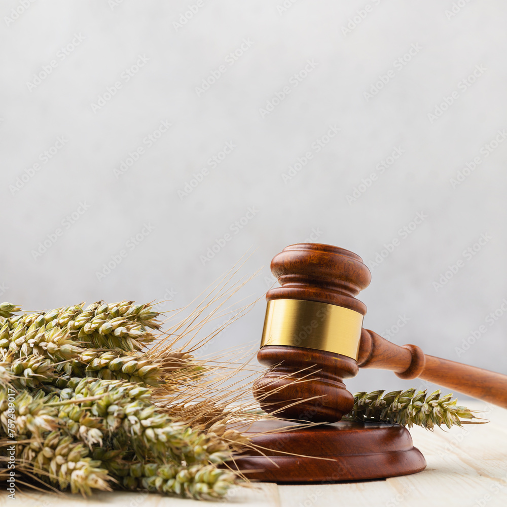 Judgment hammer, ears of wheat and barley on the table with copy space at the top of the frame, concept on the theme of grain deal, template for designer