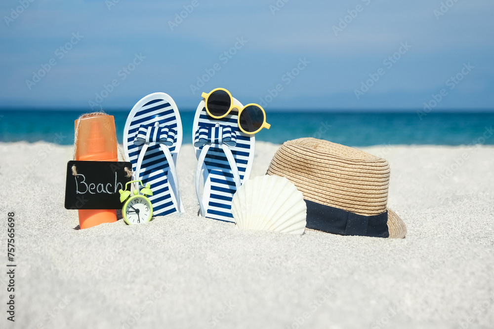 A Beach summer holiday banner background. Flip-flops and hat with a board and ball on the sand near the ocean. Tropical vacation and relax travel concept.