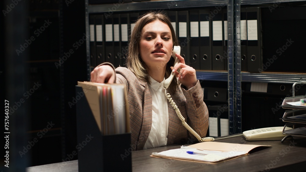 Female investigator makes phone call in police agency office inquiring for forensic report to determine legitimacy of evidence. Detective discovers important information about suspect. Tripod shot.