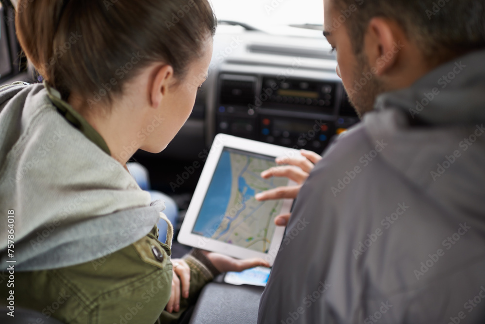Couple, car and map on road trip with navigation for direction, vacation and travel to destination in countryside. Woman, man and tablet in vehicle for tech or location to holiday journey and tourism