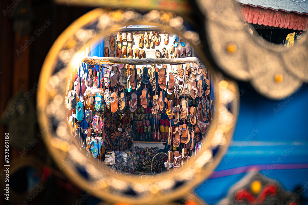 Busy market area in Essaouira, Morocco, with stalls selling various goods
