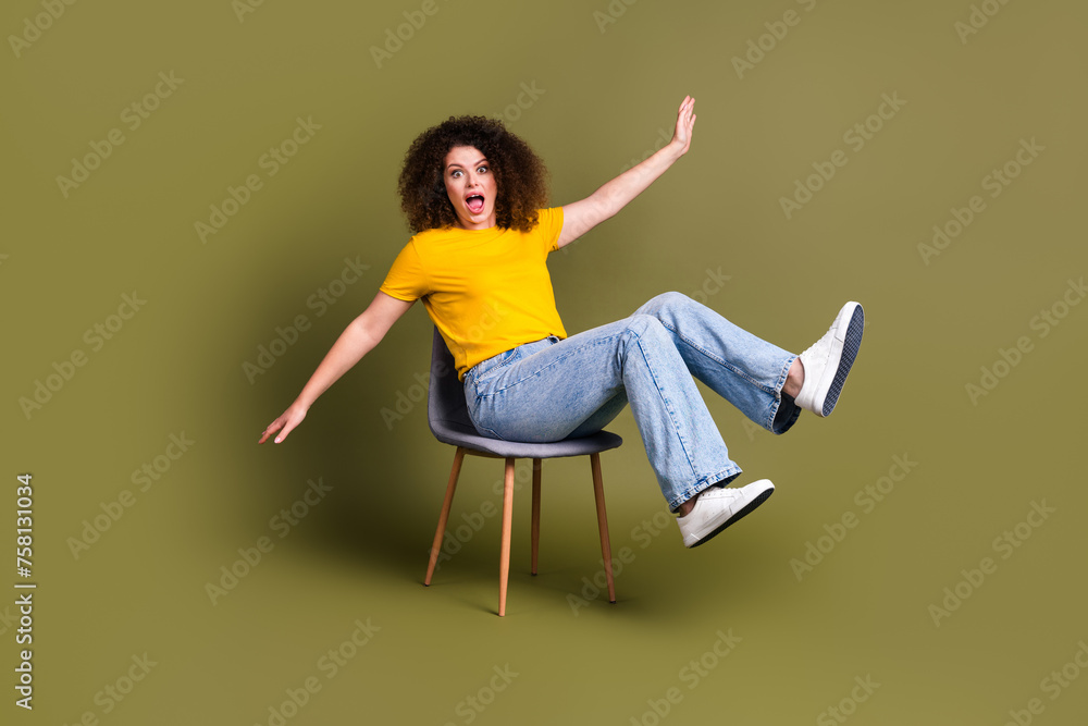 Full body length photo of funny young lady sitting chair lose balance broke stool falling down isolated over khaki color background