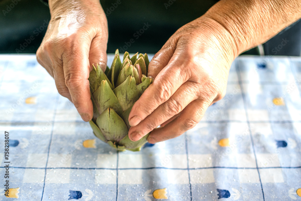 Close up view of Woman Elder hands opening artichoke on a domestic table