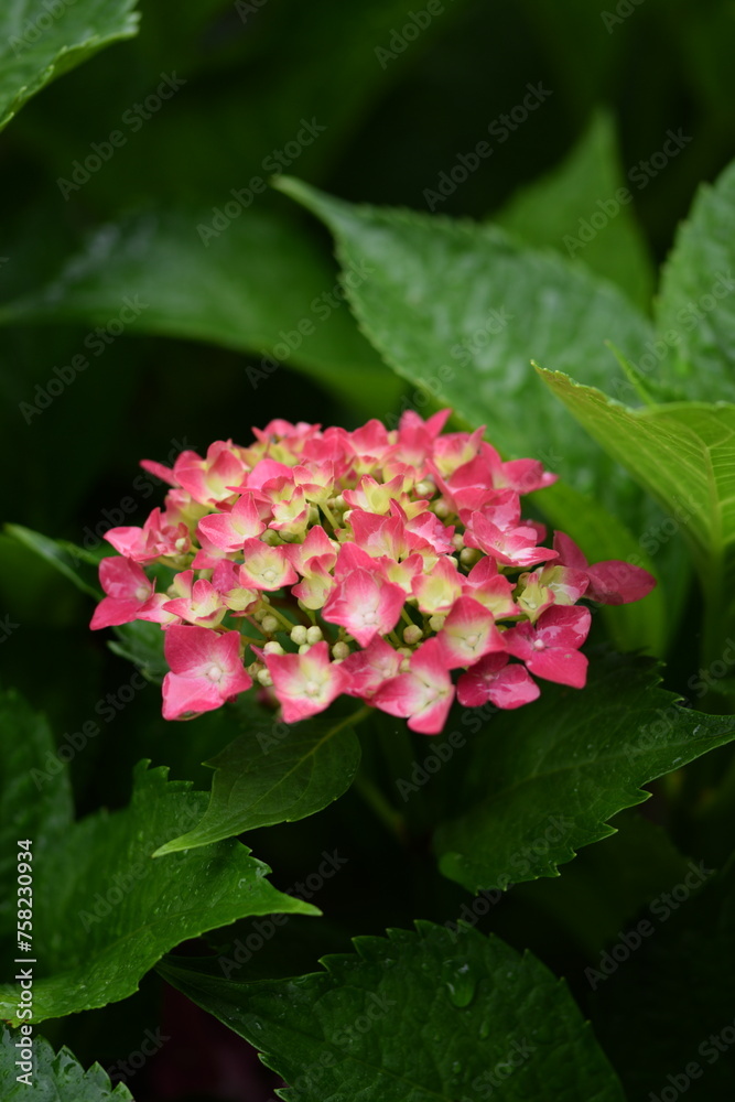 Pink hydrangea flowers among leaves, Hydrangea macrophylla starting to bloom.