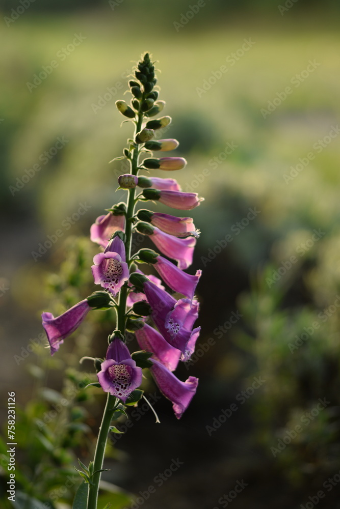Foxgloves flowers on bokeh garden background, digitalis purpurea pink flowers.