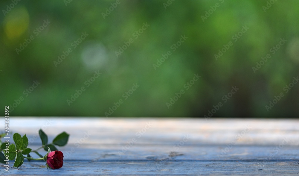 Rose flower on blue wooden bokeh table and green bokeh background with a space for text, design elements or product presentation, softly blurred background and selective focus. Right empty space.