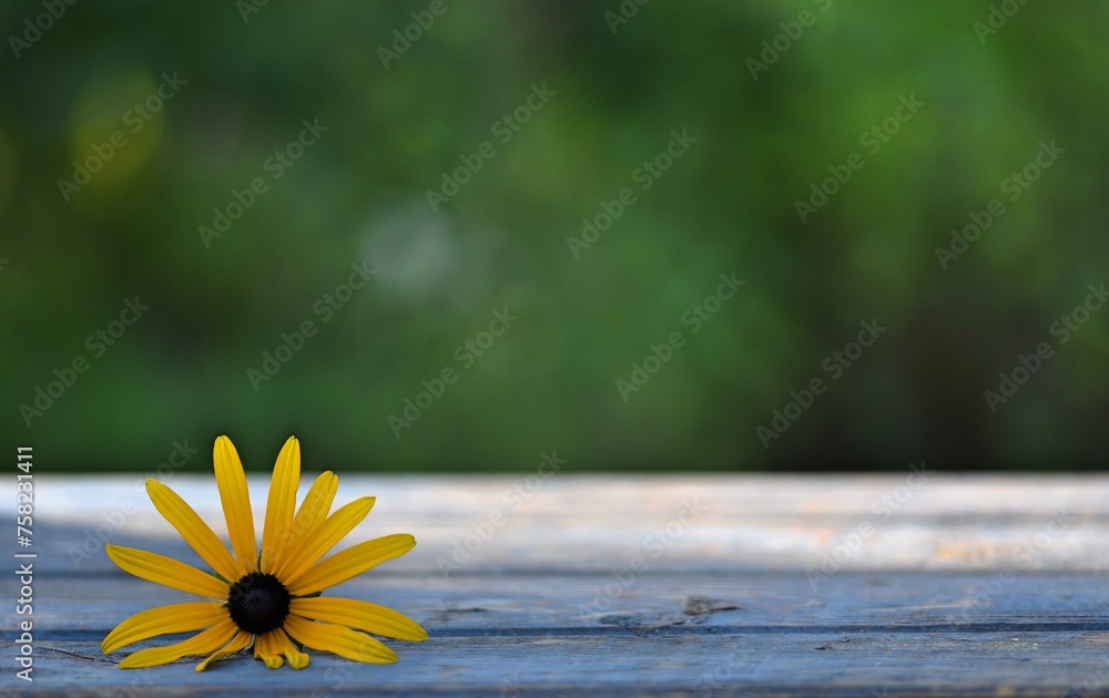 Yellow flower on blue wooden bokeh table and green bokeh background with a space for text, design elements or product presentation, softly blurred background and selective focus. Right empty space.