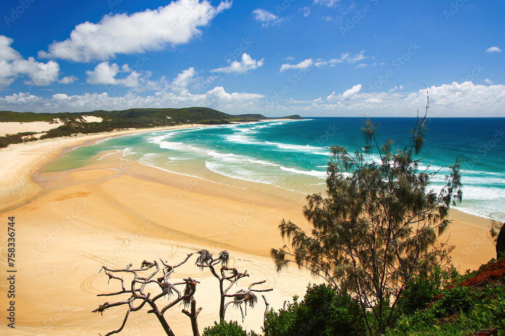 Tropical beach of the Coral Sea, as seen from a lookout on the Indian Head outcrop, a coastal headland on the eastern side of Fraser Island (K'gari) off the coast of Queensland, Australia