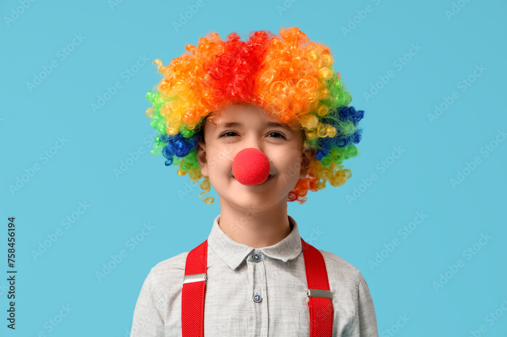 Funny little boy in clown wig and nose on blue background. April Fools Day celebration