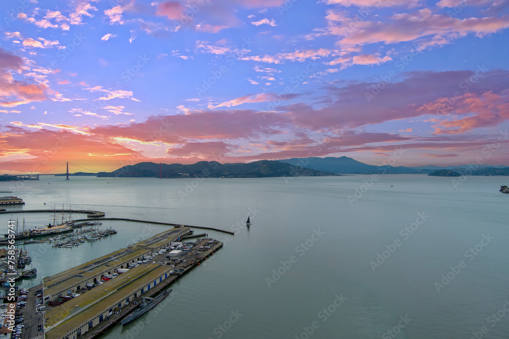 aerial shot of the Fisherman’s wharf, Aquatic Cove, the Golden Gate Bridge over the ocean water, mountain ranges and docked ships in the harbor in San Francisco California USA
