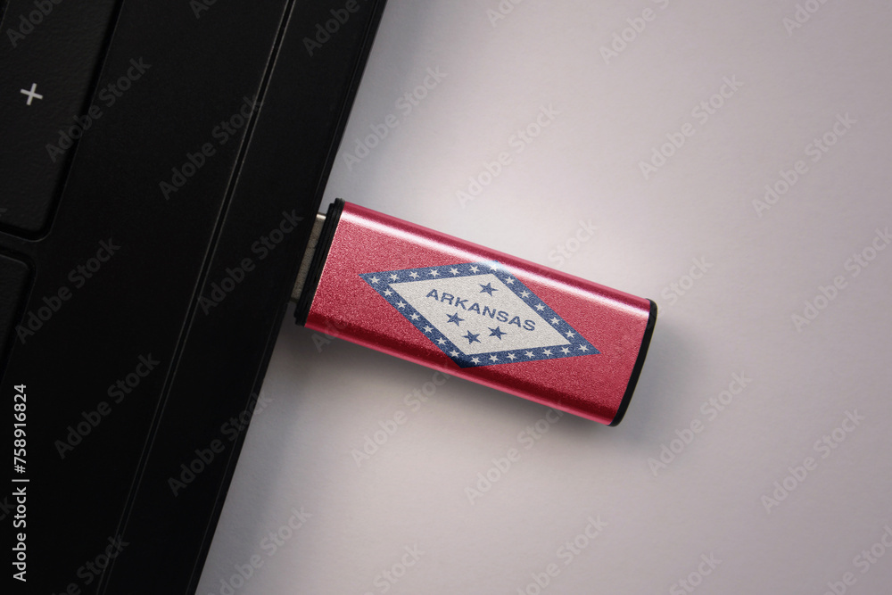 usb flash drive in notebook computer with the national flag of arkansas state on gray background.