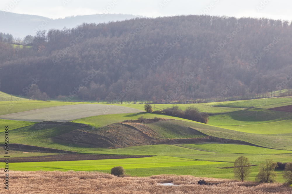View of Colfiorito swamp in spring, with hills and a mountain path in the foreground