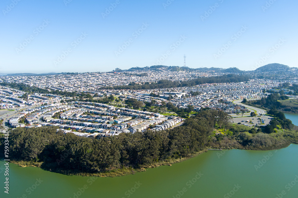 aerial shot of homes along a hillside at Lake Merced with blue lake water and lush green trees, grass and plants and blue sky in San Francisco California USA