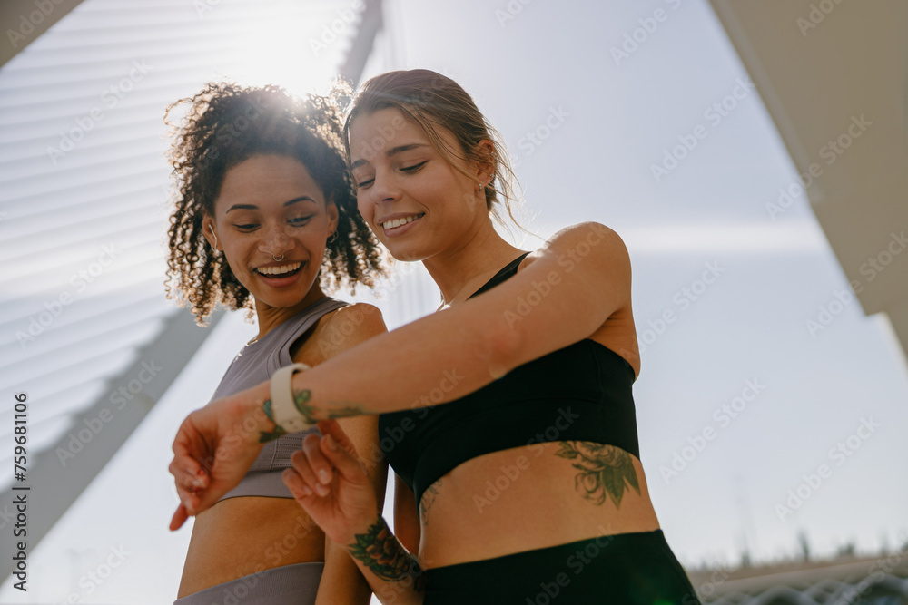 Smiling woman with female friend looking on smartwatch before exercising standing outdoors