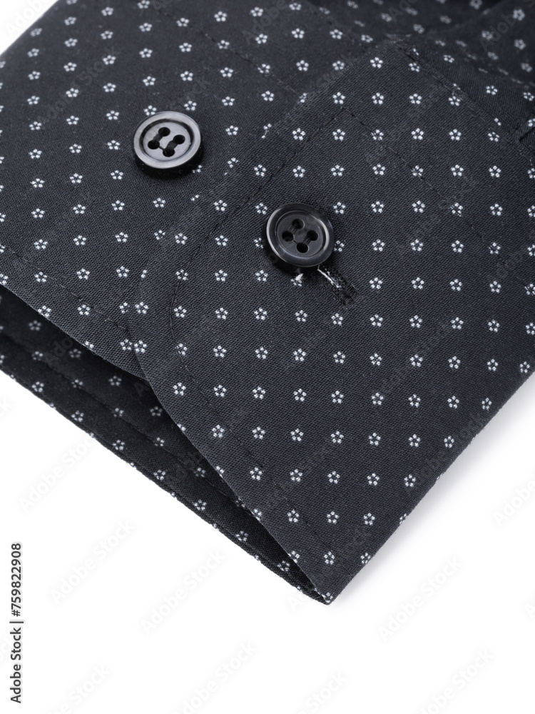 Close-up of a black shirt cuff with buttons with an abstract pattern on a white background