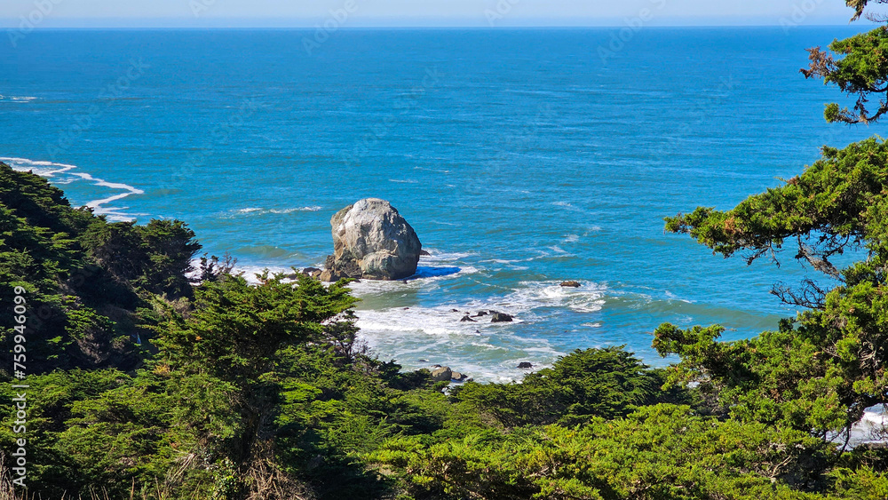 a beautiful spring landscape at Mile Rock Beach with blue ocean water, waves, rocks and lush green trees on Lands End Trail at Golden Gate National Recreation Area in San Francisco California USA