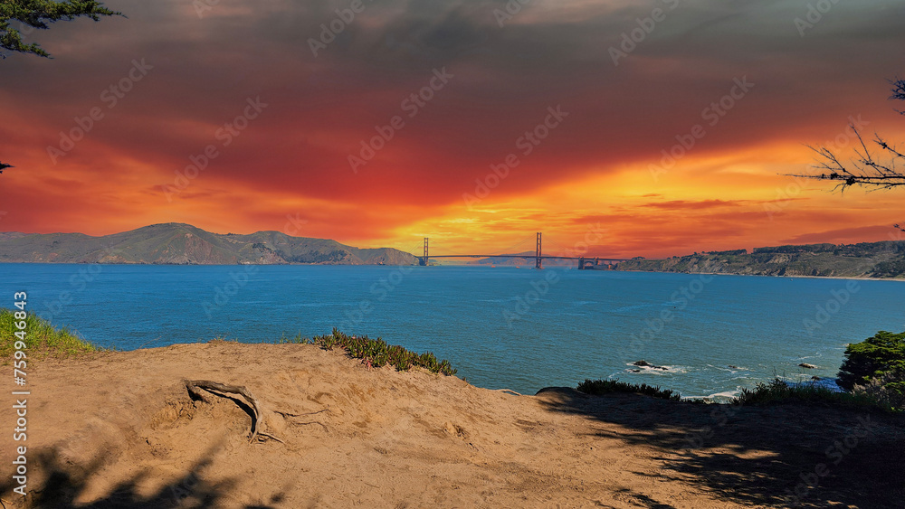 Folgende Fotos können Ihr Interesse wecken: sonnenuntergang, golden gate bridge, frisco, california, uns, fels, ozean