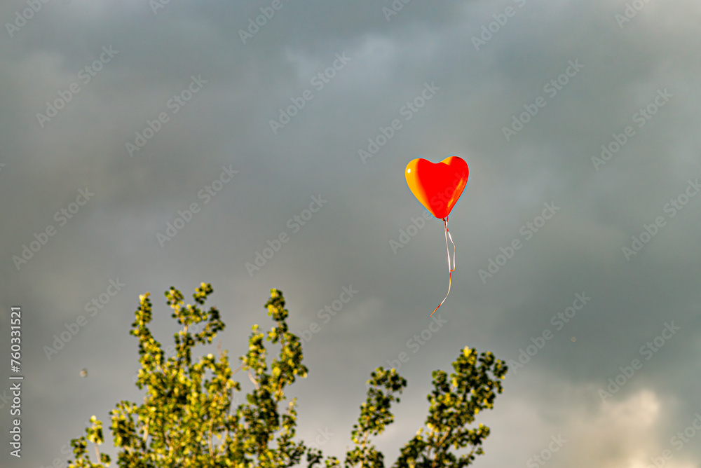 Red heart balloons over blue sky. Love, valentines day, romantic, wadding or birthday background. a red balloon in the shape of a heart is flying away into the blue sky. Letting go of my heart