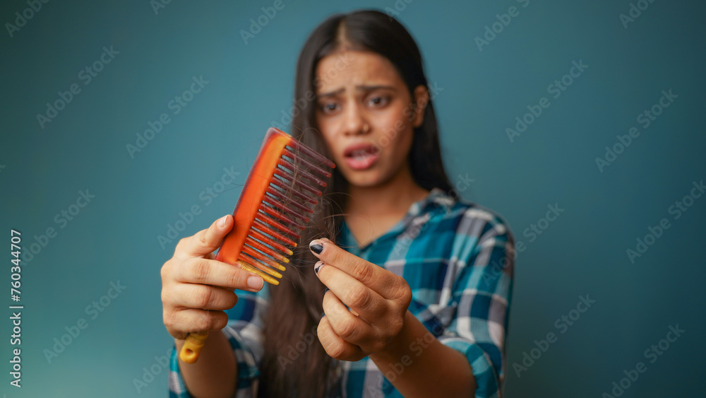 Woman with hair loss problem isolated over blue color background, hair fall concept, portrait of a Young Asian Indian girl