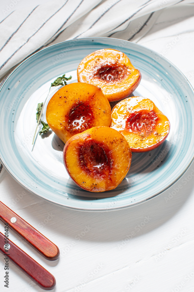 Baked peaches with honey and cinnamon in a ceramic plate. summer dessert